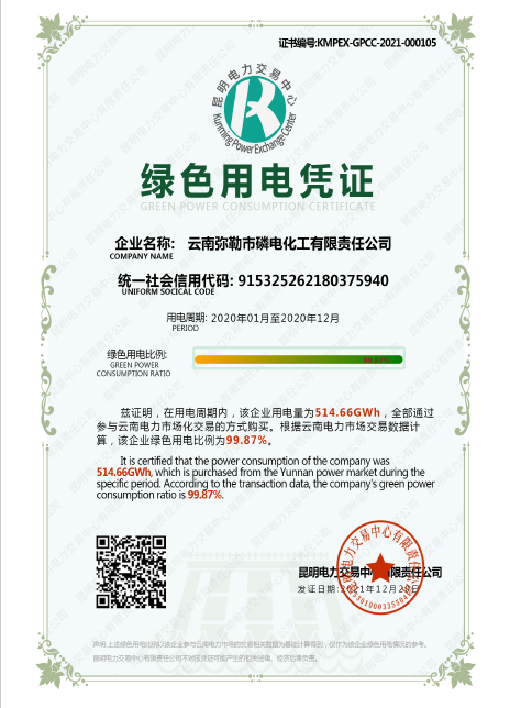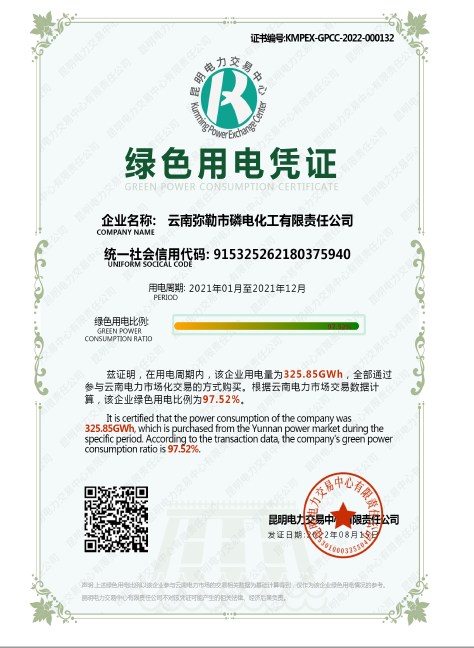 公司有员工600多名,年产黄磷6万多吨,自我配套有宜良对歌山磷矿和10.8万千瓦装机容量的雷打滩水电站,连续五年评为黄磷行业“能效领跑者标杆企业”,荣获红河州重点纳税工业企业、云南省优强民营企业、云南省“五一”劳动奖状等。